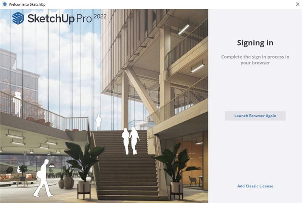 If you cannot complete the sign in process and get the following prompt message when signing in, please make sure all the instances of SketchUp, LayOut and Style Builder are closed (go to the Dock and Quit, or Force Quit if in a Mac).